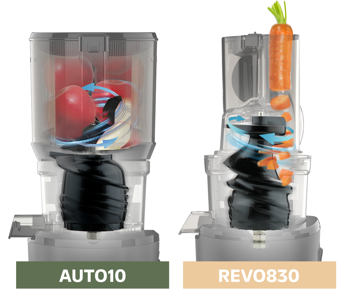 Optimized for carrots and celery, the REVO830 features a new Auto-Cut Chute that automatically chops long, fibrous ingredients. The bladeless chopping mechanism cuts and presses perfectly-sized pieces at a time, minimizing food waste while maximizing juice yield.