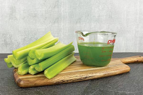 12 celery sticks (each 15 cm long) = a little over 1 cup of celery juice.