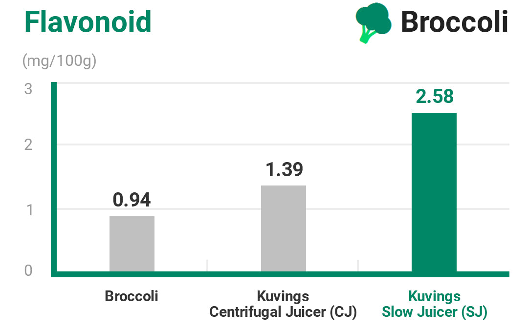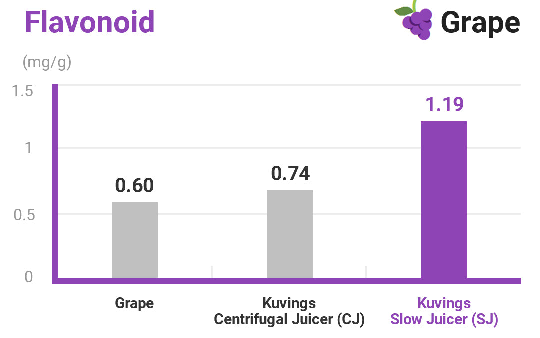 Flavonoid : Juice from a slow juicer contains 1.5 times more flavonoids than fruit and juice from a centrifugal juicer