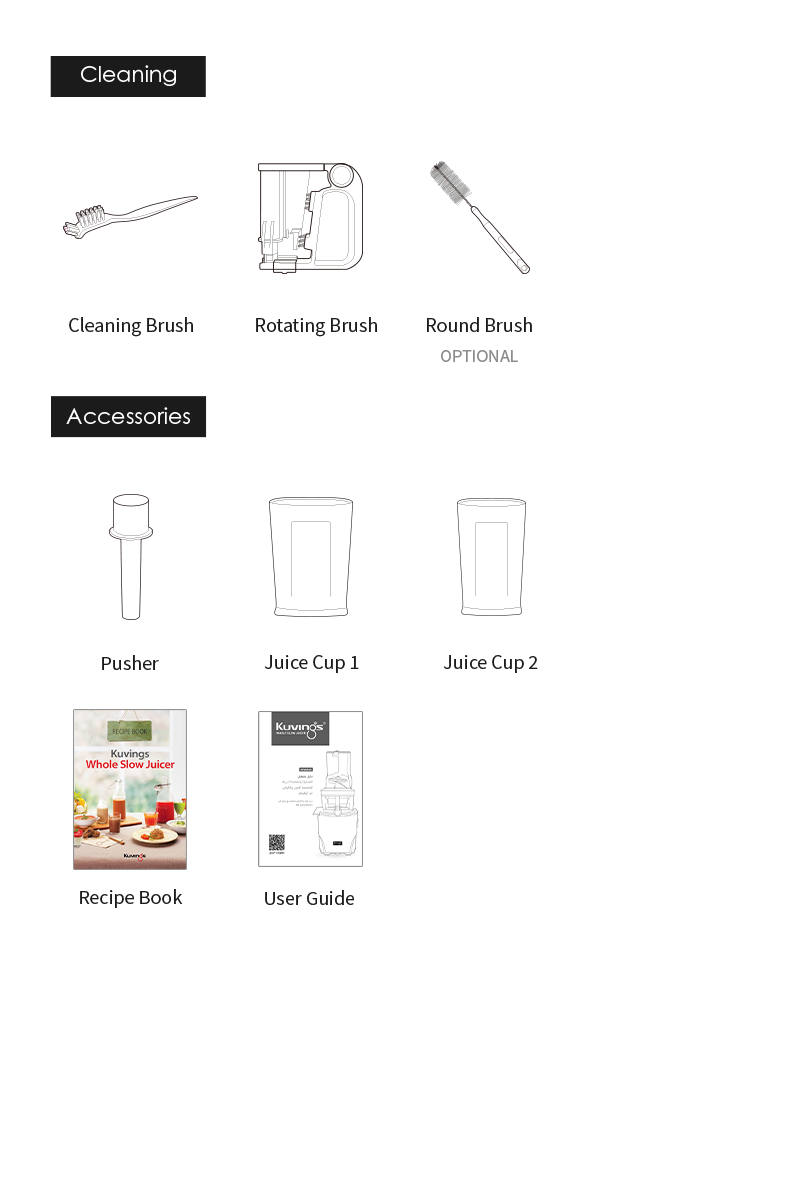 What's in the box : Cleaning Brush, Juice Jug, Juicing Strainer, Pulp Jug, Pusher, Recipe Book, Manual, Rotation Brush