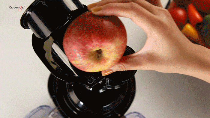 The 90mm flip gate for whole fruits and 43mm auto-cutting chute for leafy vegetables, carrots are combined to create a New feeding chute for Kuvings.